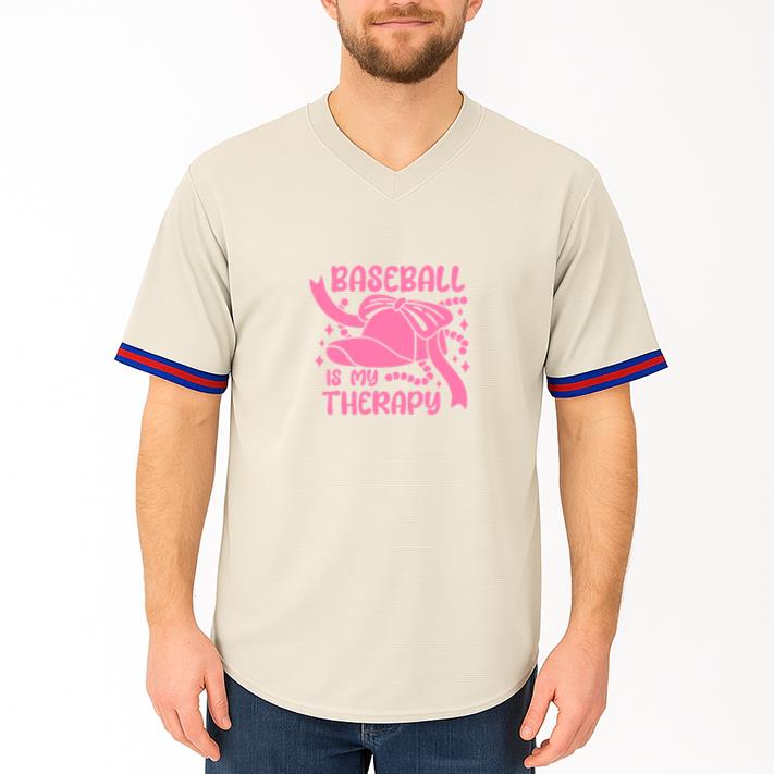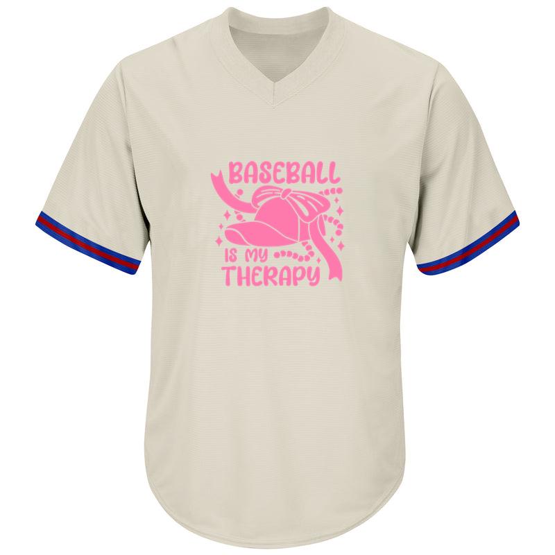 Elevate your baseball gear with Baseball Is My Therapy Cut Out Design Baseball Jersey baseball jersey. This masterpiece showcases your unique style and love for the game. With intricate embroidery, it becomes a true work of art.